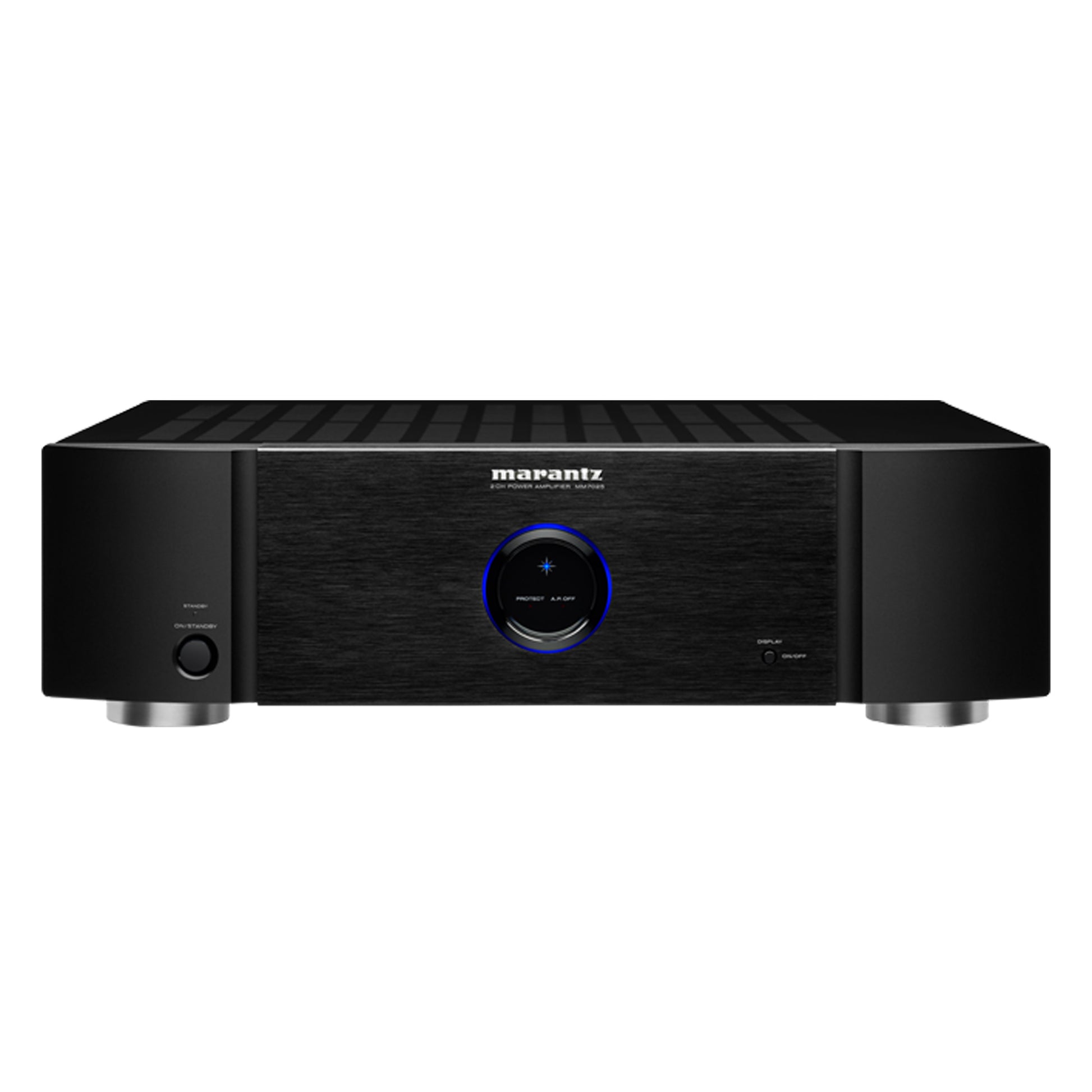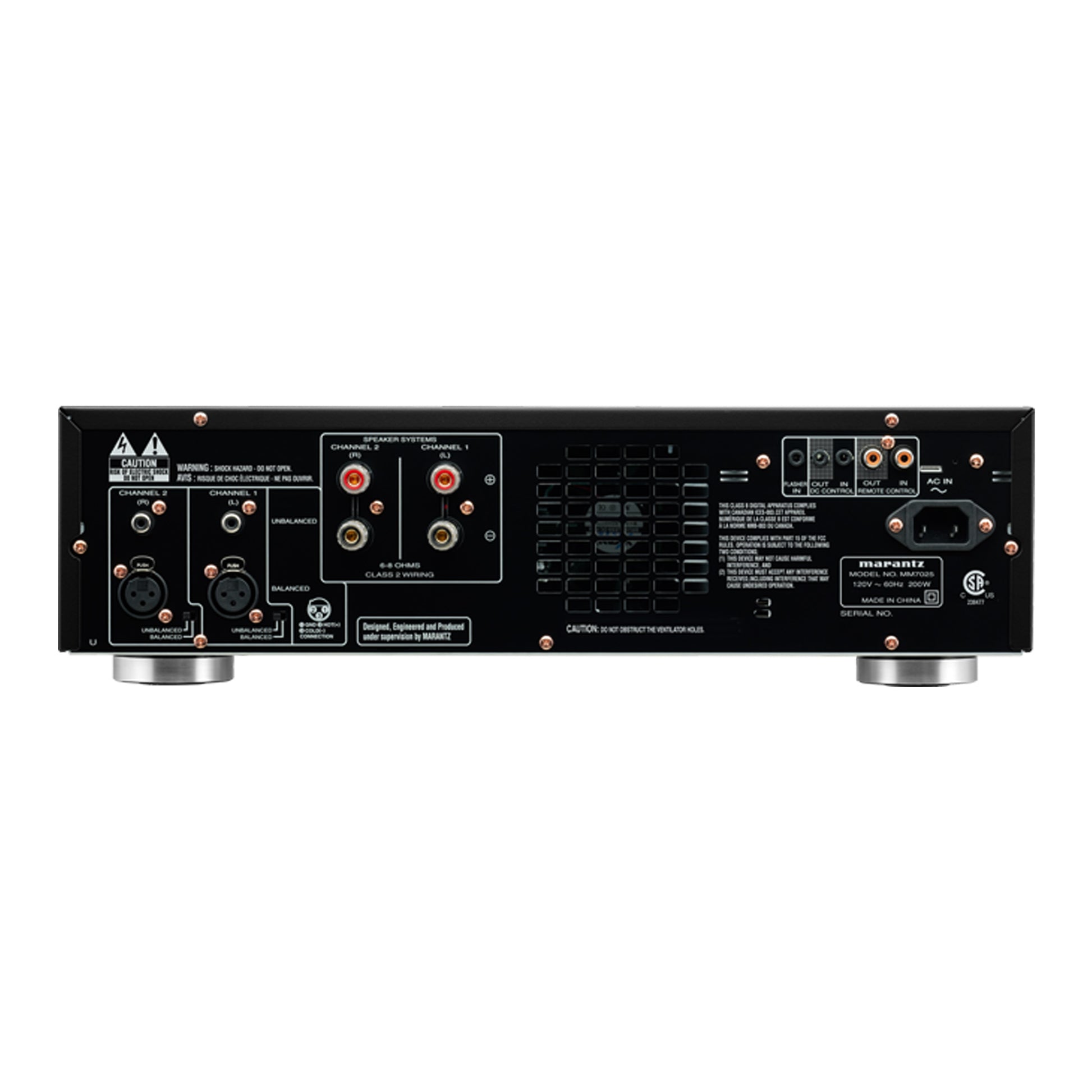 The MM7025’s advanced technology serves all your listening needs. Current feedback circuits, also used in Marantz’s Reference Series amps, insure the purest sonic reproduction regardless of source. Another MM7025 virtue, and one directly traceable to its substantial current capability, is the control it establishes over difficult speakers to reproduce both dynamic musical peaks and whispered dialog without blemish.