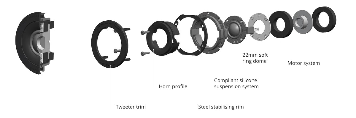- Uses a 22mm decoupled High Frequency Driver with wide surround creating a wide even dispersion of stereo